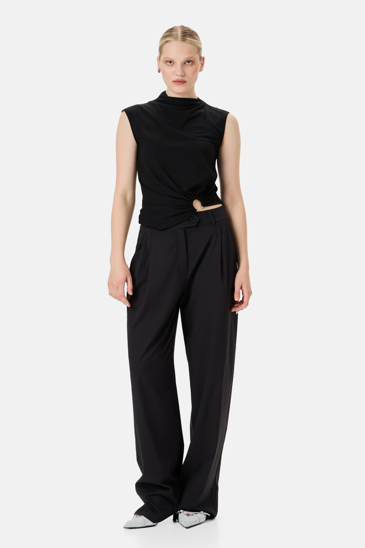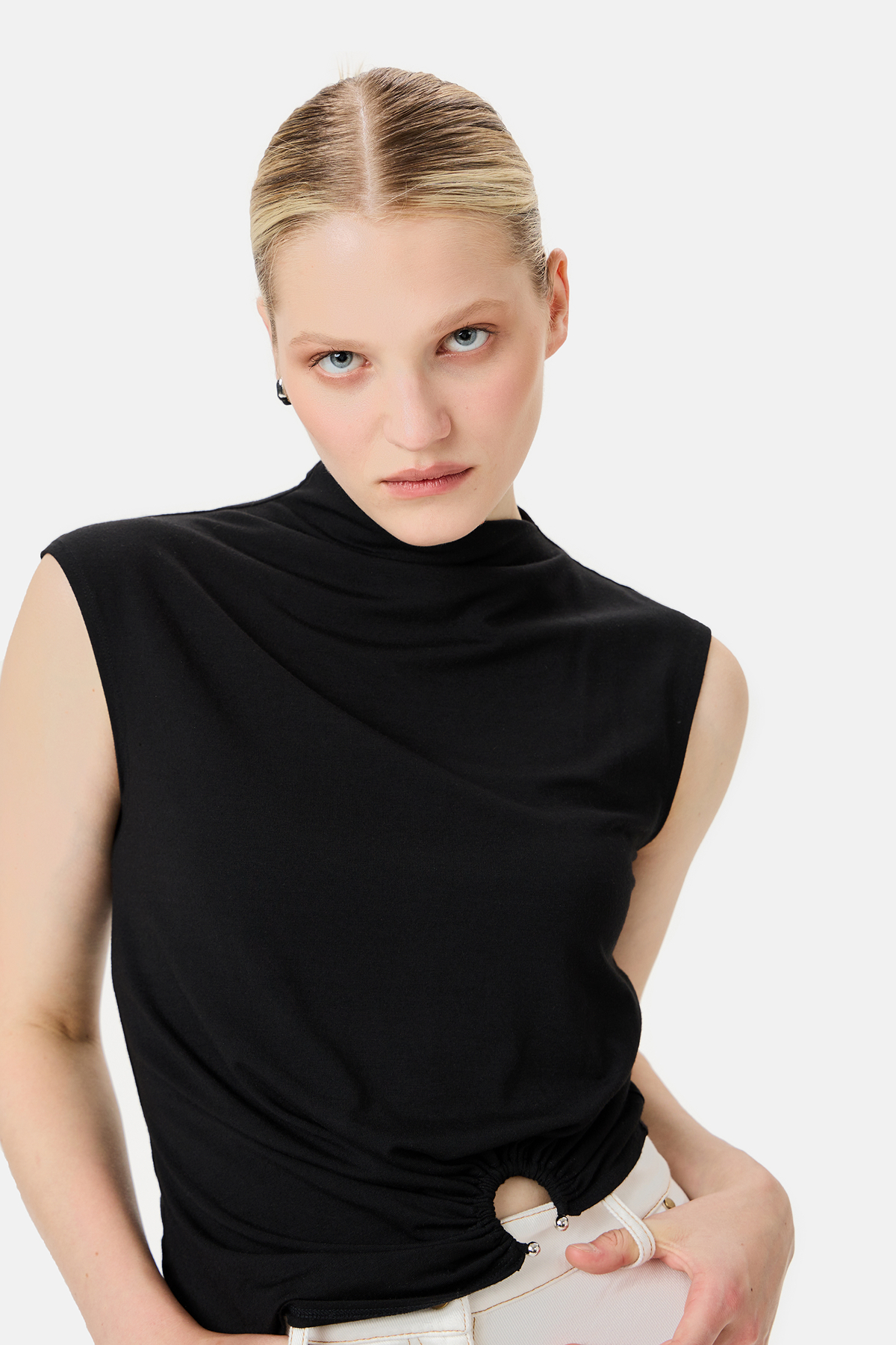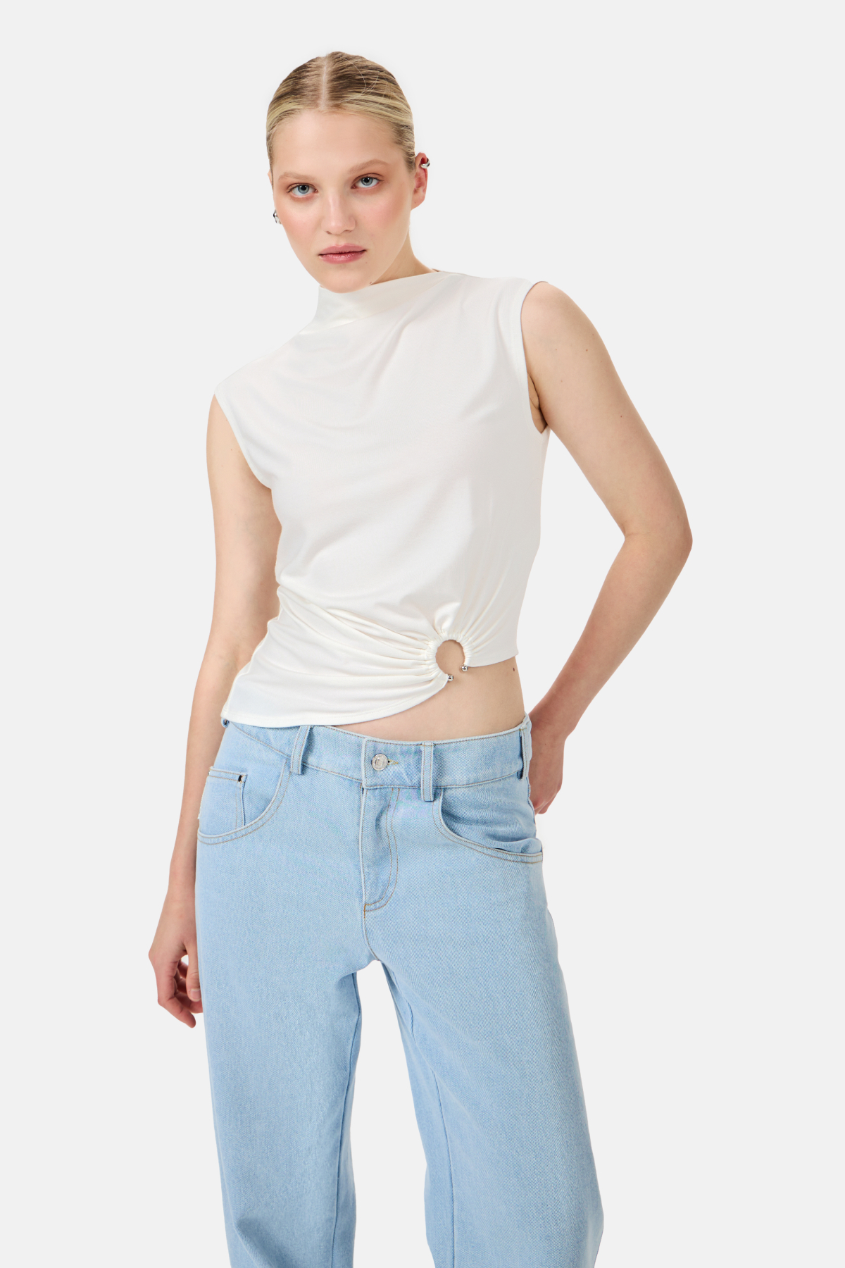 Топ с расширенной, но мягкой линией плеч, приталенным силуэтом, асимметрией, драпировкой, изящным (и съёмным) металлическим акцентом. Выполнен из модала — настоящего шелка в трикотажной форме. Супермягкого, дышащего, влаговпитывающего, прочного и отлично подходящего для жары.