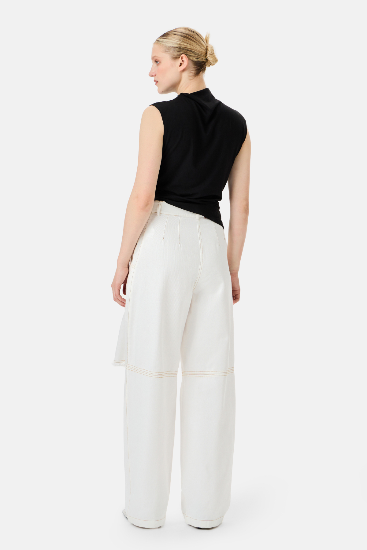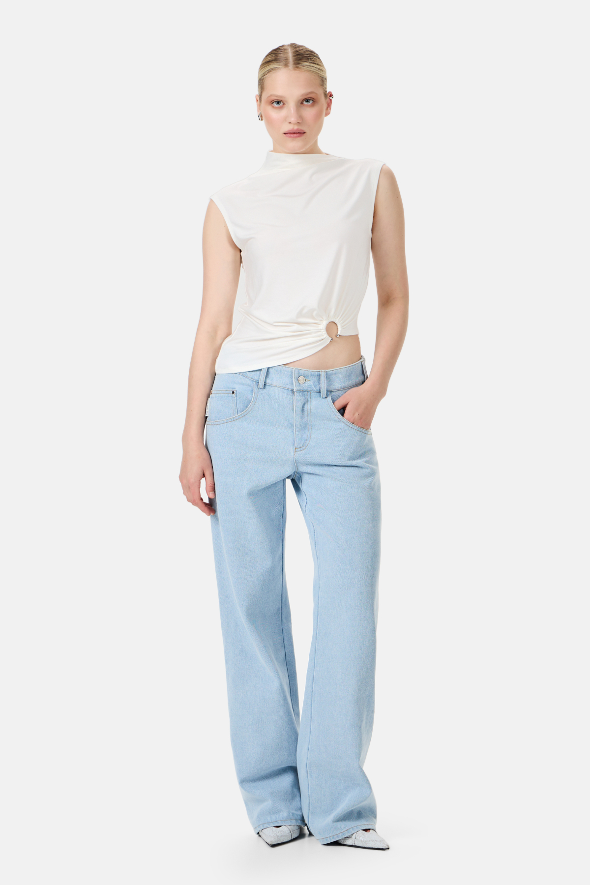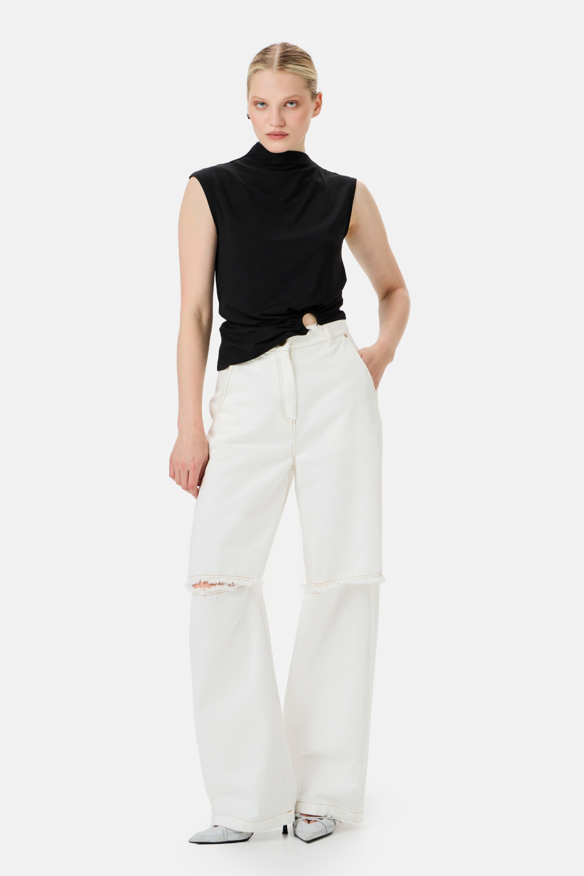 Топ с расширенной, но мягкой линией плеч, приталенным силуэтом, асимметрией, драпировкой, изящным (и съёмным) металлическим акцентом. Выполнен из модала — настоящего шелка в трикотажной форме. Супермягкого, дышащего, влаговпитывающего, прочного и отлично подходящего для жары.