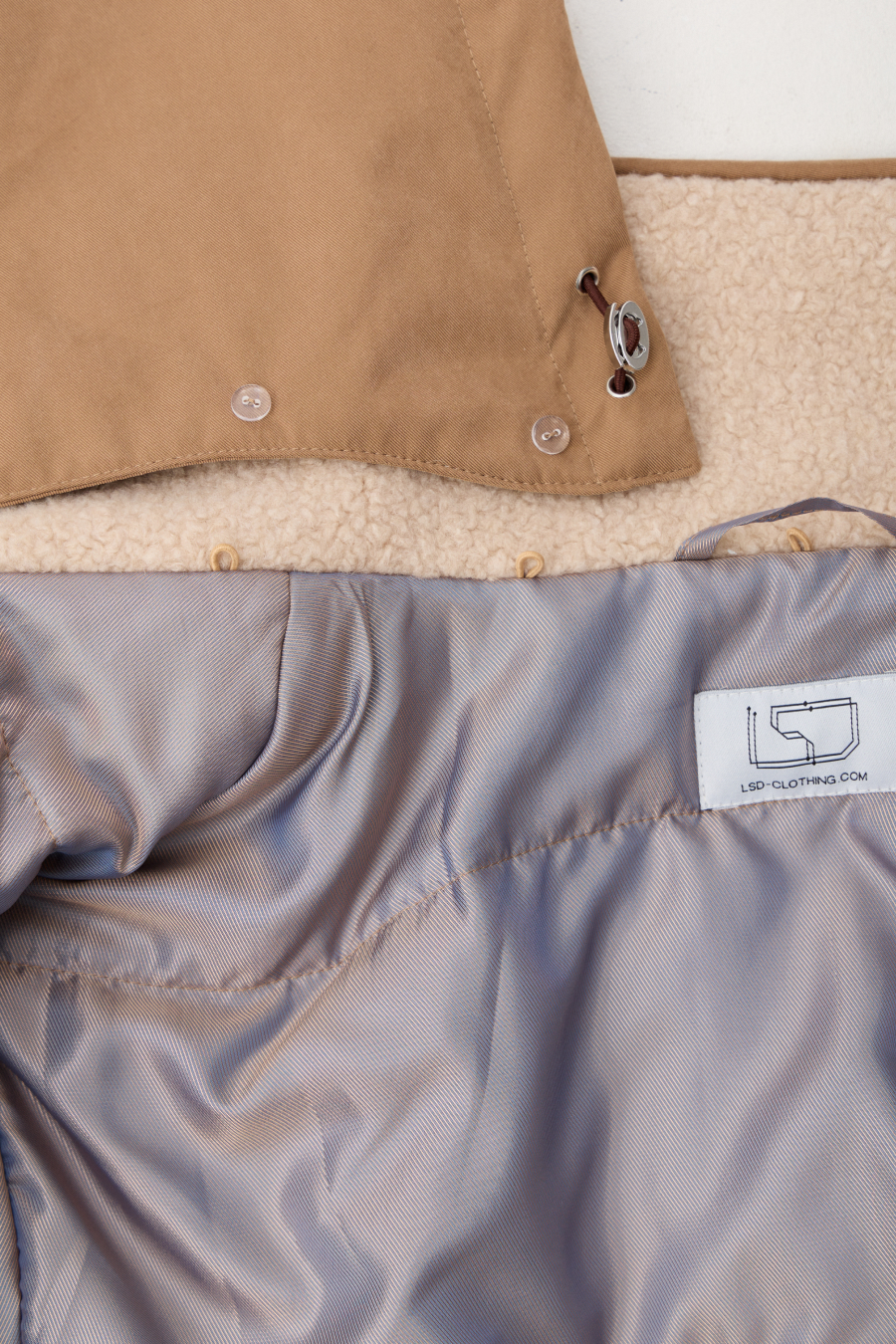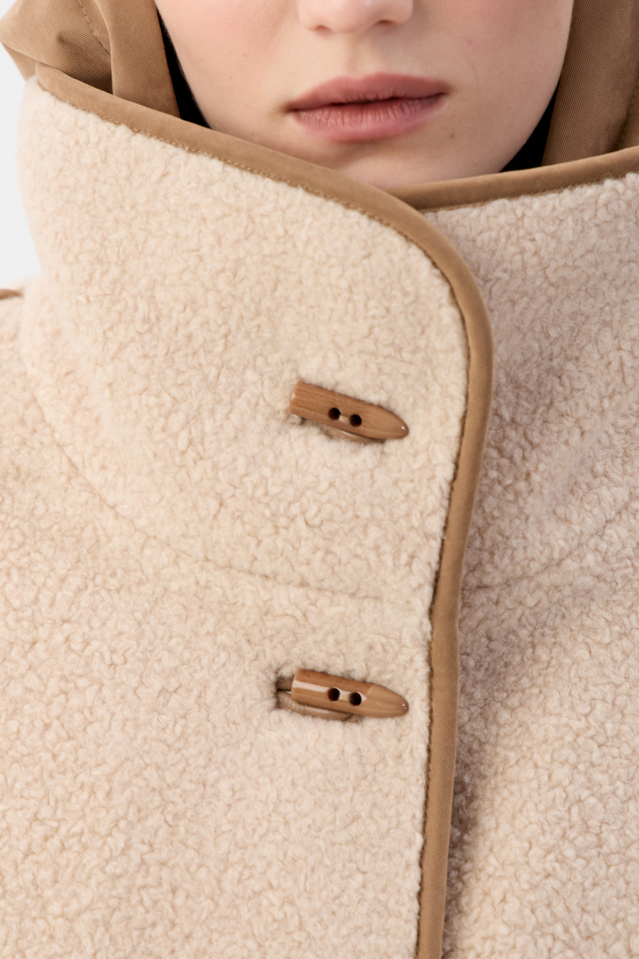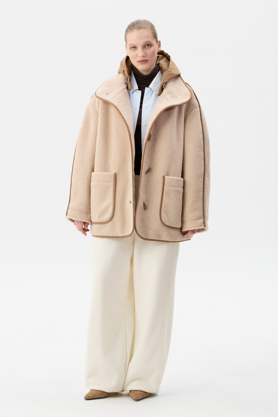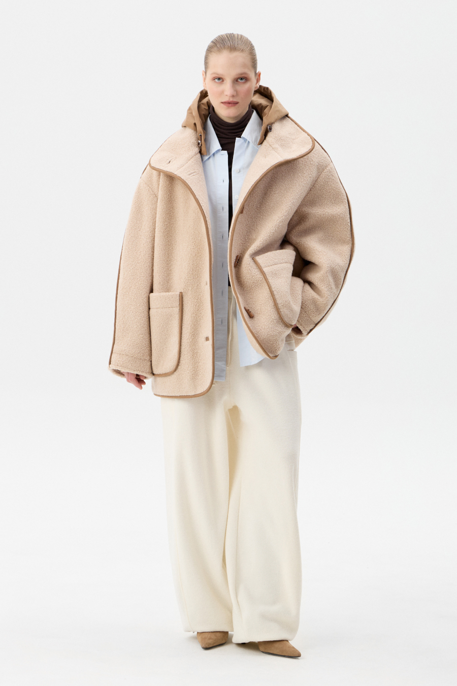 Куртка из экомеха с бельгийским утеплителем Isosoft. Длина ниже линии бедра, прямой силуэт, спущенная линия плеча для дополнительного объема. Застёжка на 5 пуговиц. На передней части куртки расположено два накладных кармана. Модель оснащена съёмным капюшоном из плащёвой ткани.