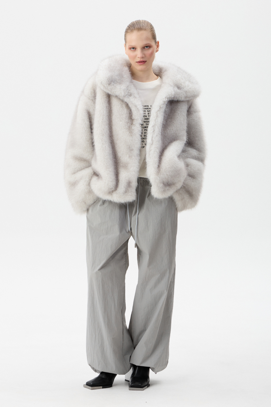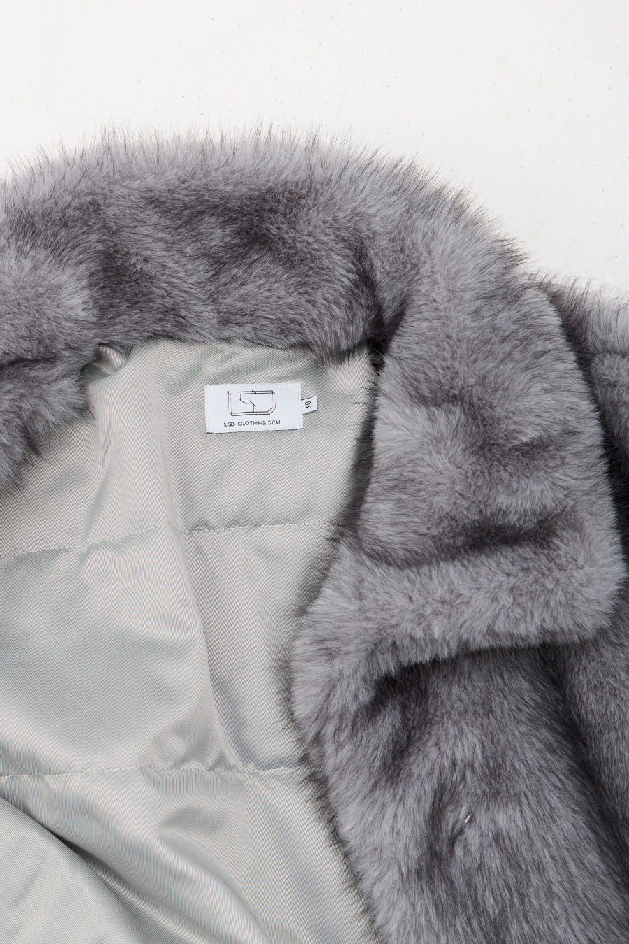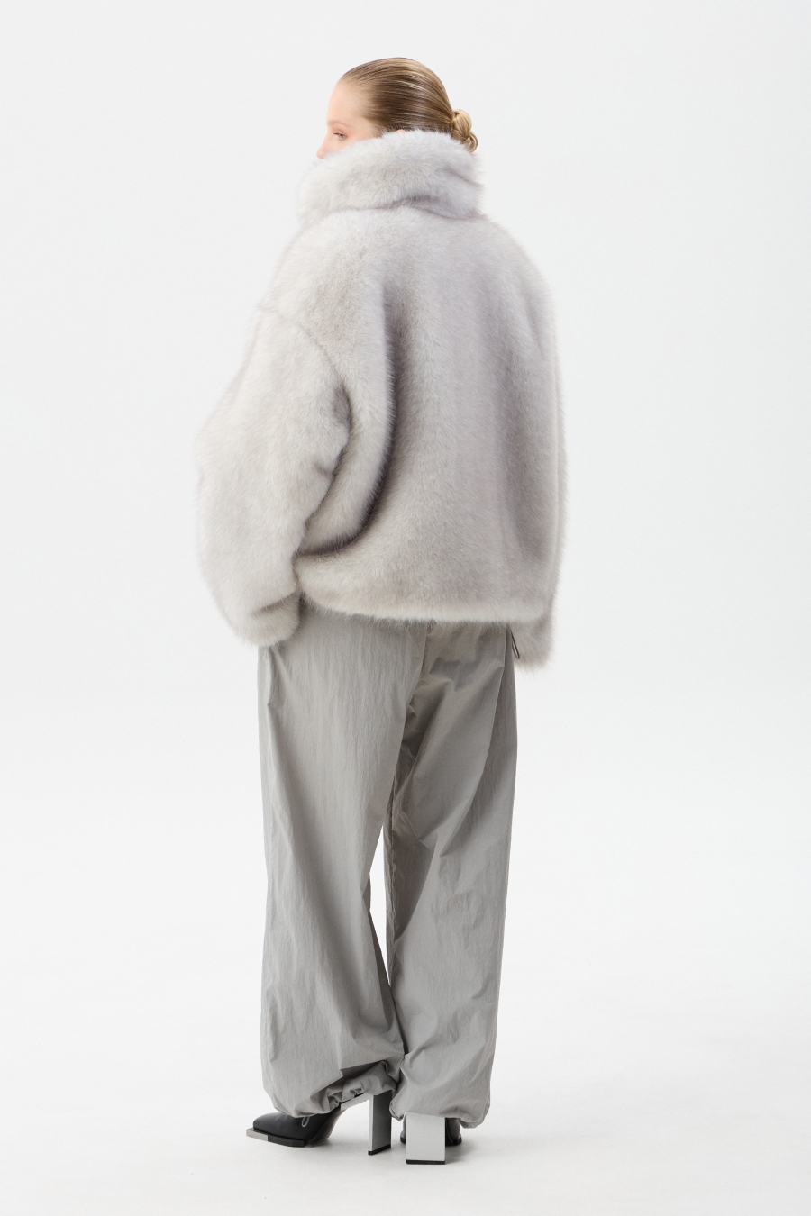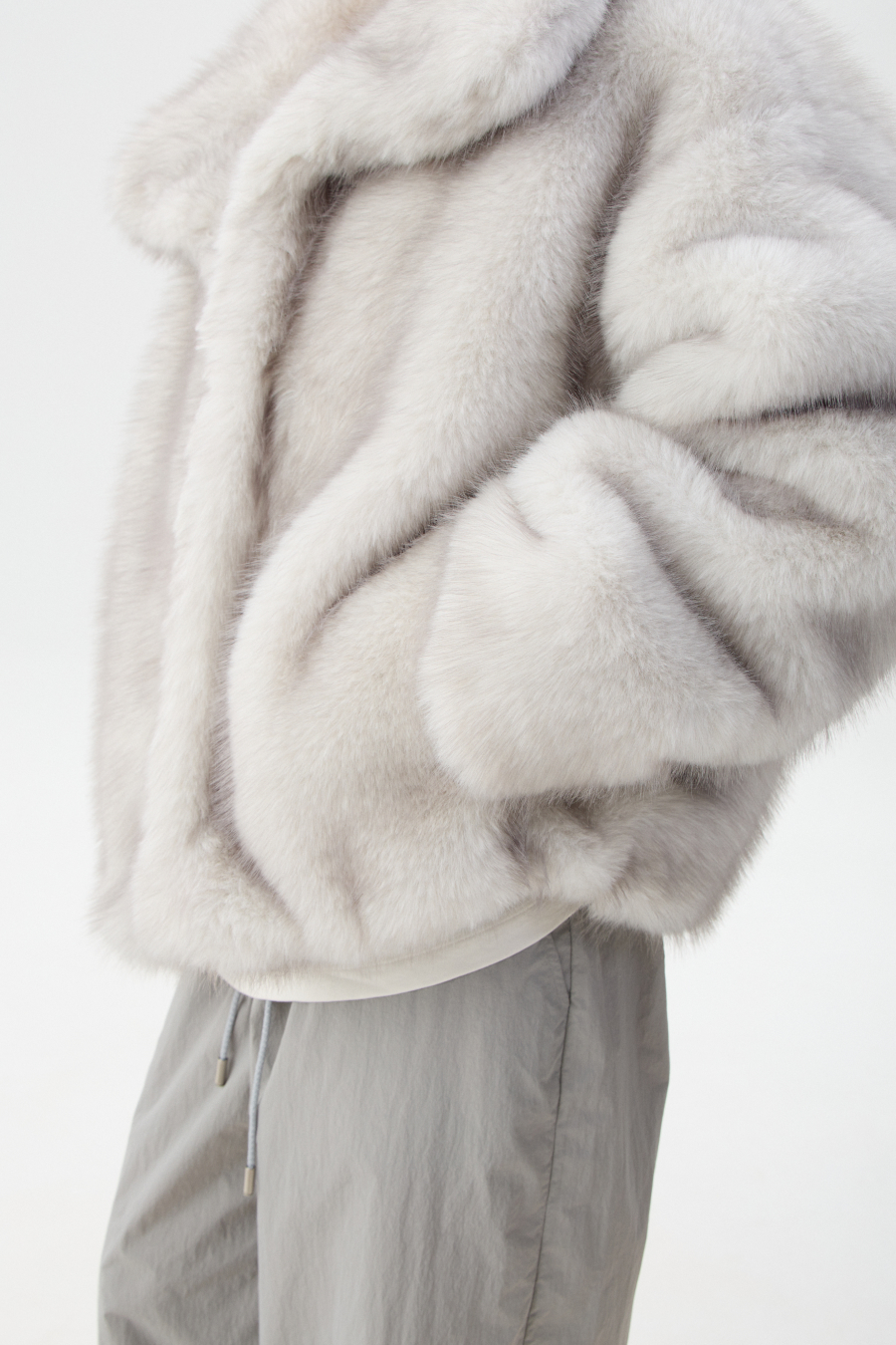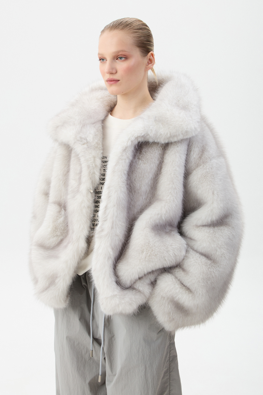 Шуба застёгивается на четыре шубных крючка. В воротнике-стойке предусмотрен магнит для фиксации. По спинке и переду шубы выполнены рельефные швы. По бокам расопложены глубокие карманы с тактильной подкладкой внутри. Низ изделия регулируется шнур-резинкой с фиксатором.