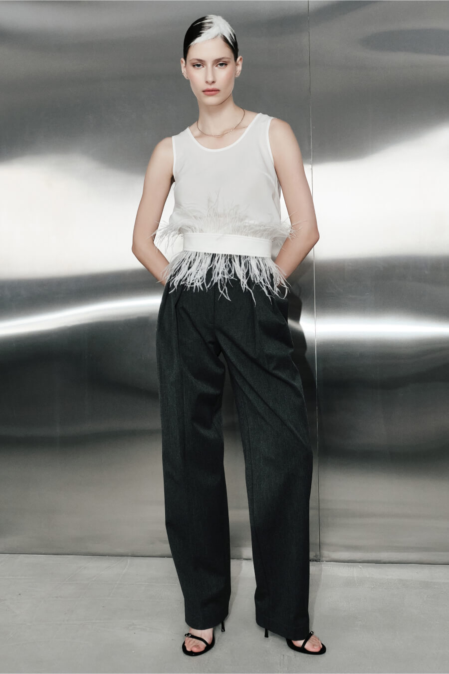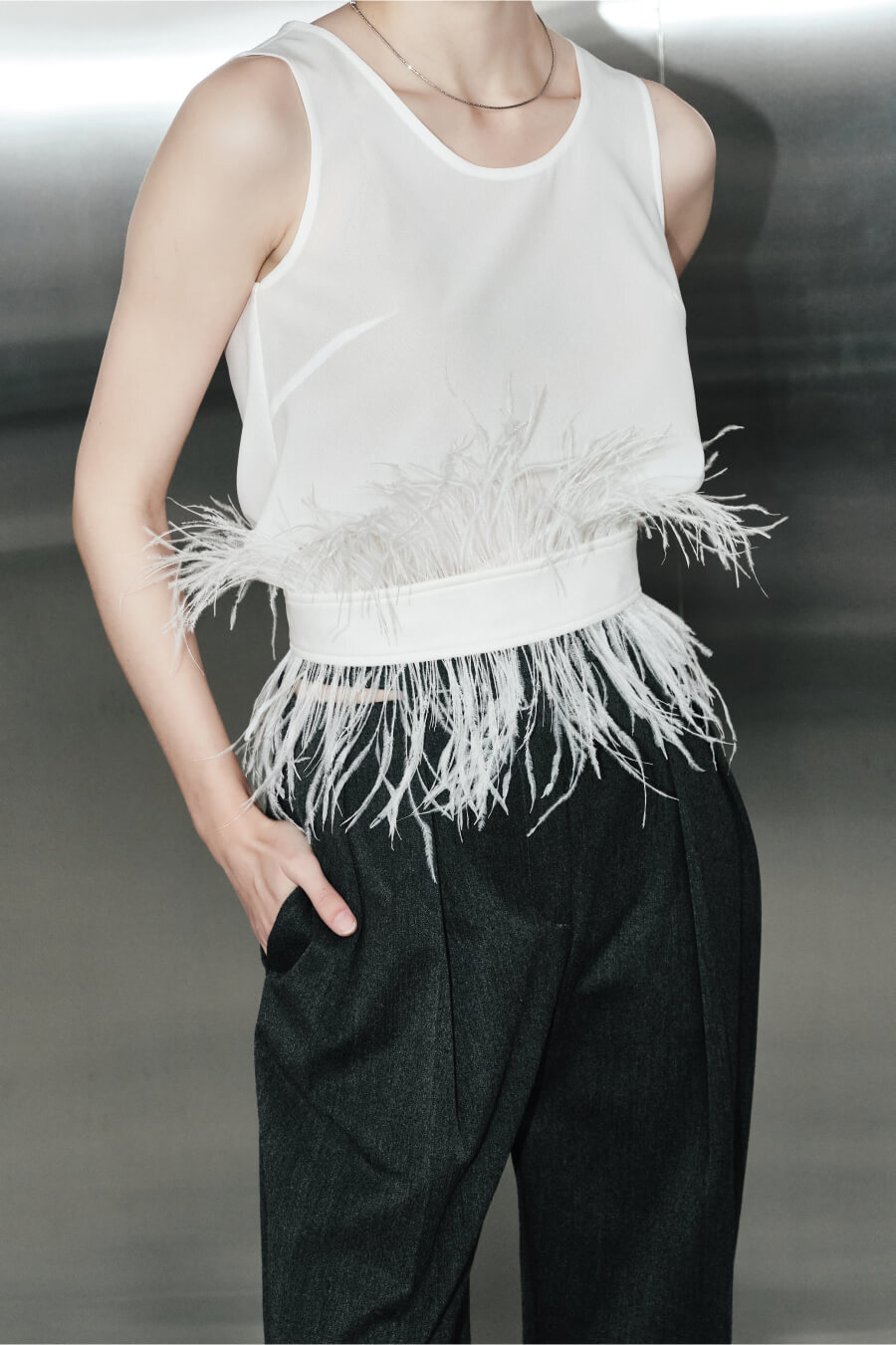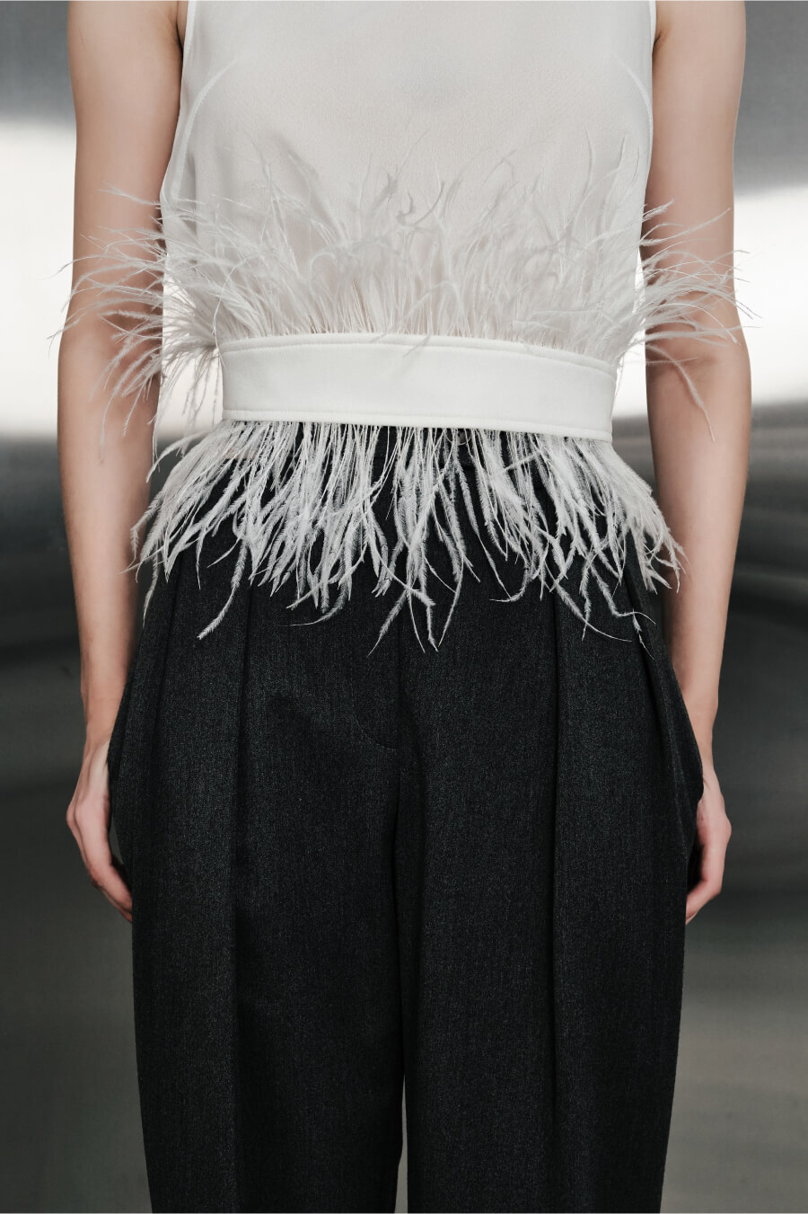 Айтем-праздник, созданный добавлять акцент в любой образ. Основание пояса выполнено из белой замши, которую с двух сторон обрамляют перья в тон. Обхват регулируется корсетной шнуровкой.